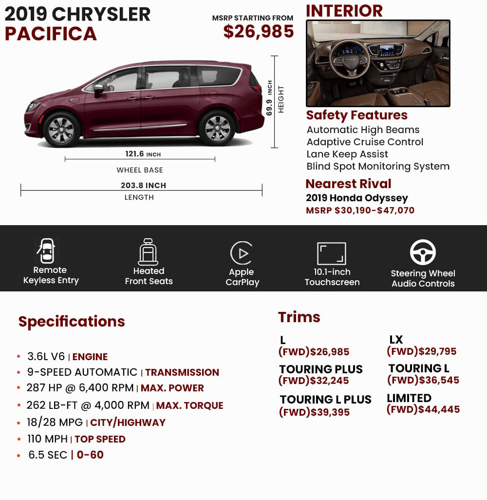 8 rows 2019 Chrysler Pacifica Exclusive Interior and Exterior Pictures View latest Pictures. Get the most useful specifications data and other technical specs for the 2019 Chrysler Pacifica Hybrid Limited 35th Anniversary FWD. See body style engine info and more specs.
